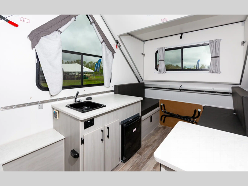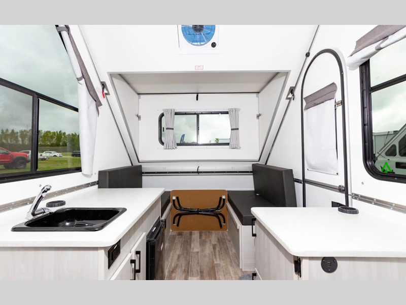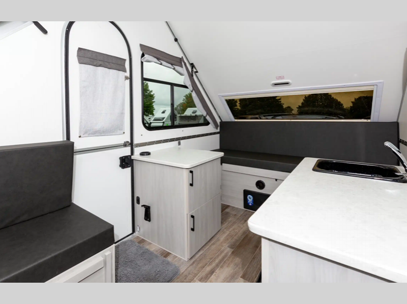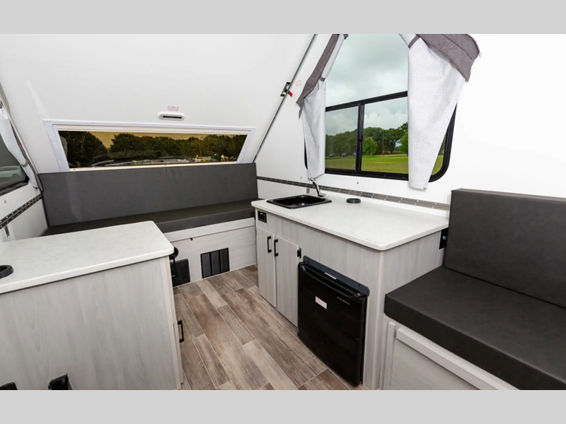 This camper is built on a tubular steel frame and includes Azdel composite roof/sidewalls for added durability. There are also aluminum wheels, a Dexter rubber torsion axle, and four stabilizer jacks to help keep your camper secure when you're at camp. You'll love the LED lights inside, along with the Fantastic fan and exterior outlets to keep your gadgets charged!